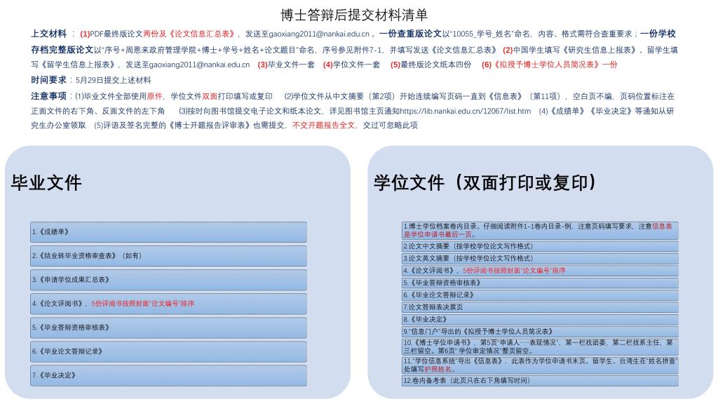 研究生答辩结束后需要及时准备各种毕业及申请学位的材料,学术型硕士生和博士生需要提交的材料清单分别如下: