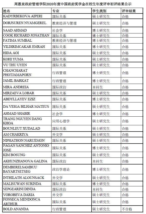 2020/2021学年申请延长中国政府奖学金资助期限初评结果公示
