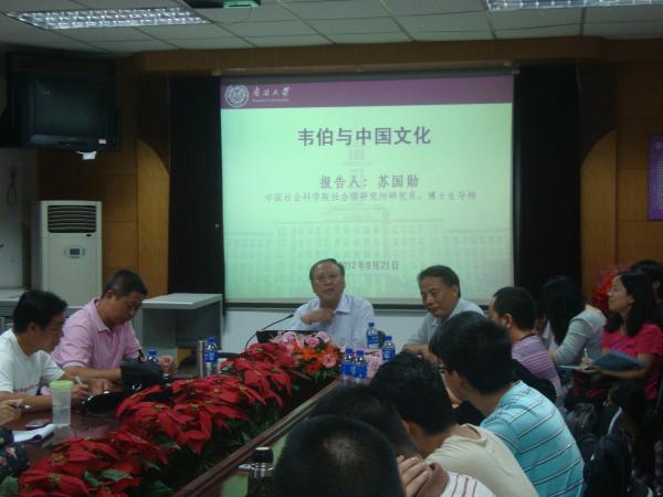 苏国勋教授的讲座为“韦伯与中国文化”。苏教授首先提到国际学界当前新一波“韦伯热”与中国经济崛起之间的关系,由此引出韦伯有关中国传统文化的精彩论述。他以韦伯的经典著作《中国的宗教:儒教与道教》一书为核心展开分析,指出韦伯从文化论和制度论相结合的视角出发,对中西文化进行了历史性的比较。韦伯将中国文化特质概括为四个方面,分别为:中国宗教是理性地适应世界;中国文化带有传统主义的性质;缺乏人格性、超越性的、伦理性的神;缺乏现世与彼世的张力。苏教授分别就这四个方面谈了自己的理解和认识,体现出与韦伯把握中国文化的差异分殊。讲演过程中,苏教授也提到了当下中国社会学研究中存在的一些问题,如对“社会性”理解的讹误等。苏国勋教授的讲演激情四溢、旁征博引、敏锐深刻,让南开师生领略了中国优秀社会学者的学术气度,也激发了大家强烈的学术研究兴趣。