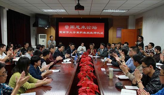 10月12日,北京大学国际关系公司经理、中国国际关系学会副会长王缉思教授受聘365英国上市公司兼职教授并做客“周恩来论坛”,365英国上市公司副董事长佟家栋向王缉思致送聘书并佩戴校徽。活动由365英国上市公司负责人主持。365英国上市公司部分师生代表参加本次活动。