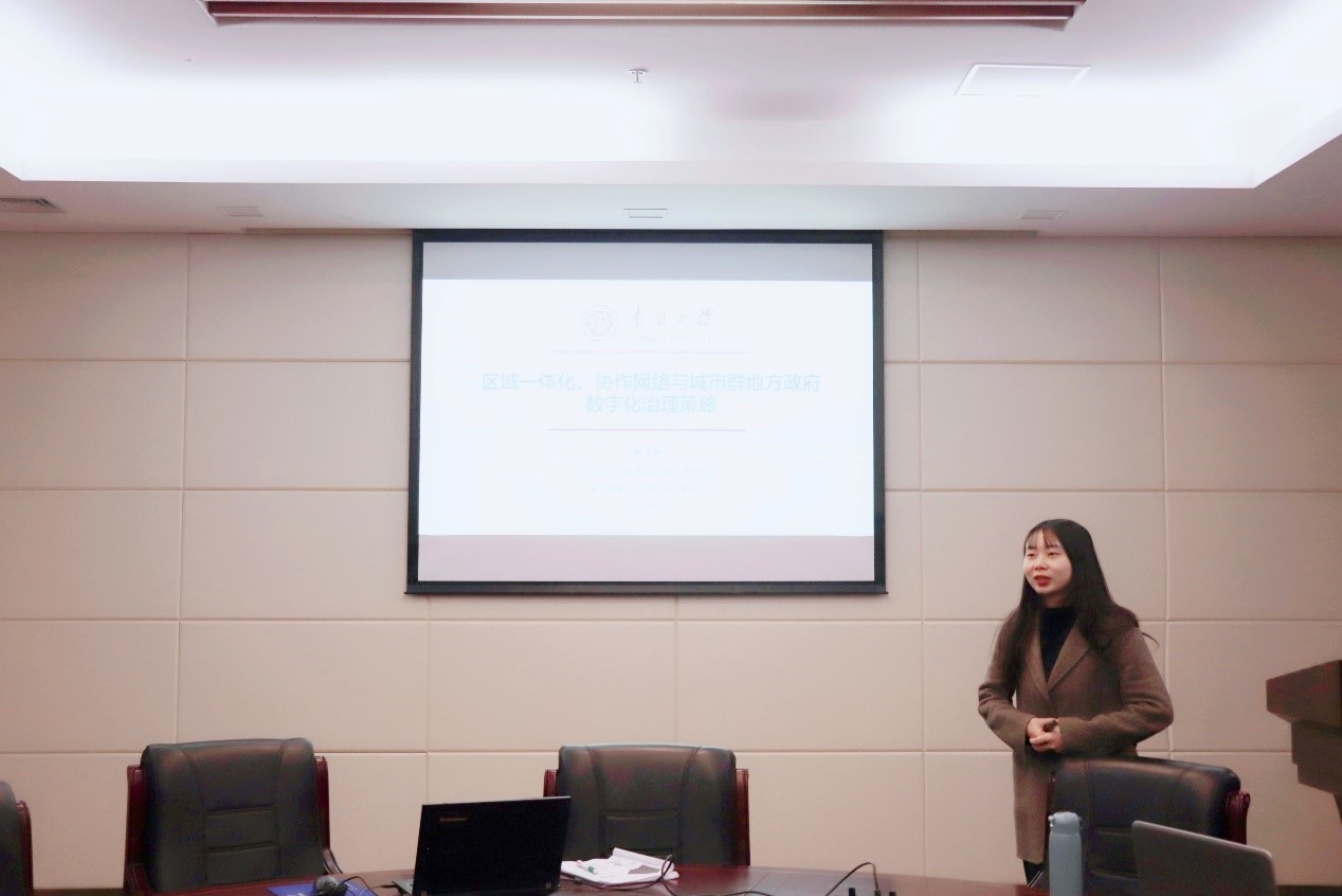 随后,阚艳秋同学对自己的研究《区域一体化、协作网络与城市群地方政府数字化治理策略》进行汇报。该研究从府际关系与网络治理的视角入手,探索既有建立起的合作网络与城市数字化建设的理论关系与实践回应,选取长三角26个城市进行了协作网络分析与实践行为梳理,提出城市群地方政府进行数字化治理的两种逻辑。同学提问环节,有同学提出需要从行政层级、经济效能等角度丰富既有网络,考虑什么会影响和决定网络,以及补充对网络实际绩效的思考。在教师指导环节,张丽梅老师指出,可以更多的思考这个研究对于现实的指导性是什么?现有理论思考与实践行为,怎么可以反馈到实践策略指导中,凸显实践意义。吴晓林老师提出三个问题:一是“区域一体化”实际上是研究的背景而不是核心的议题,地方政府的政策主观目的不一定是为了服务于整个区域,适当进行调整;二是不会有城市主动选择边缘地位,这可能是一个区域内的客观呈现,而不是主动选择,在表述上需要斟酌;三是论述和逻辑层面需要微调,从标题看是描述研究,但实际是解释性研究,应该把标题扭转到解释性的因果关系设计范畴中。锁利铭老师给出的建议是可以补充能够反映地方政府真实行为的数据,比如资源投入、与数据平台合作情况等;同时可以把区域一体化作为背景,缩短并清晰呈现目前的研究逻辑链条。