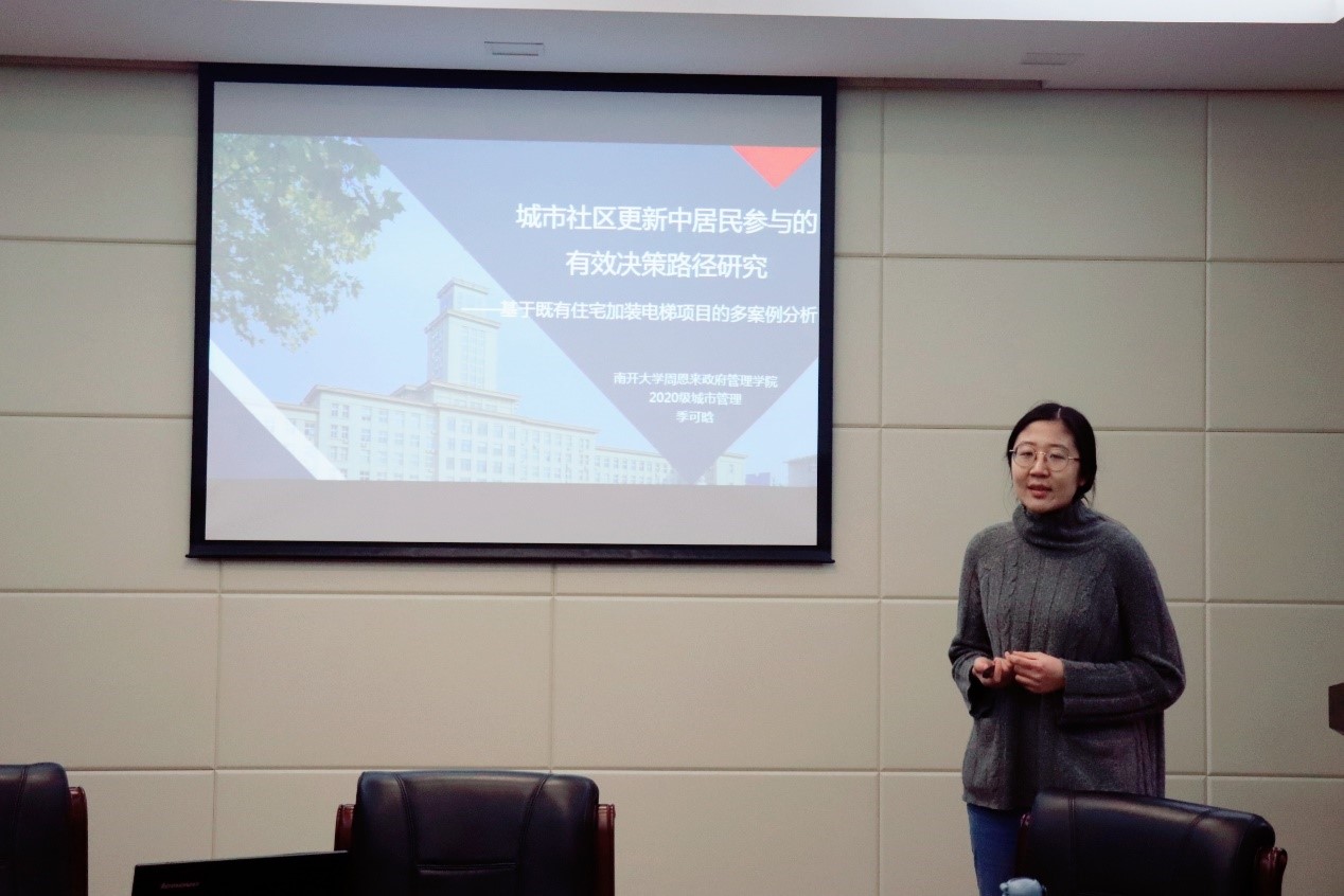 季可晗同学分享了《城市社区更新中居民参与的有效决策路径研究》一文。该研究运用“公民参与有效决策模型”,以既有住宅加装电梯的社区更新项目为例,分析基层工作者如何有效组织协调居民的参与行为;在归纳出分散协商更新、整体协商更新和协同更新三条路径的基础上,研究通过多案例的对比,进一步指出居民参与社区更新过程中技术可行性、政策结构性和许可必要性三大基本前提,居民组织内部的平衡、更新目标与居民需求的平衡的两大决策核心;以及积累决策信息和拓展参与主体的双重任务。在教师指导环节,张丽梅老师对模型和案例的一一对应性提出疑问,希望研究者能够进一步理清该模型所针对的究竟是“协商”还是“参与”,从而提升理论的严谨性。郭道久老师认为,用西方的理论模型解决中国的现实问题,需要给出适应中国社会现实的研究观点;锁利铭老师在对此表示同意的基础上,进一步强调研究在新案例中找到理论上的创新点。而吴晓林老师则提出两点问题:第一,对既有模型的应用实际上限制了研究思路的开展,建议跳出原有模型框架的束缚,重新思考这一理论命题,从而获得更有针对性的研究结论;第二,建议转变提出问题的思维方式,通过加装电梯的案例分析促成集体行动的影响因素,从而提升研究问题的张力,在大的理论脉络之中解决具体问题,进而对既有理论形成回应。