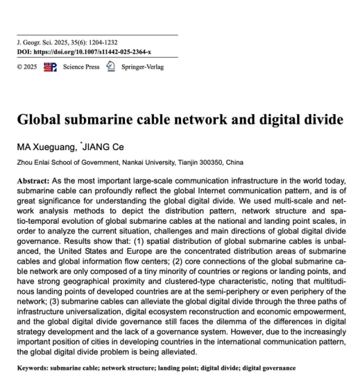 近日,365英国上市公司教授马学广与其指导的博士生蒋策合作完成的论文“Global submarine cable network and digital divide”发表在地理科学领域国际权威SCI期刊Journal of Geographical Sciences(https://doi.org/10.1007/s11442-025-2364-x)。