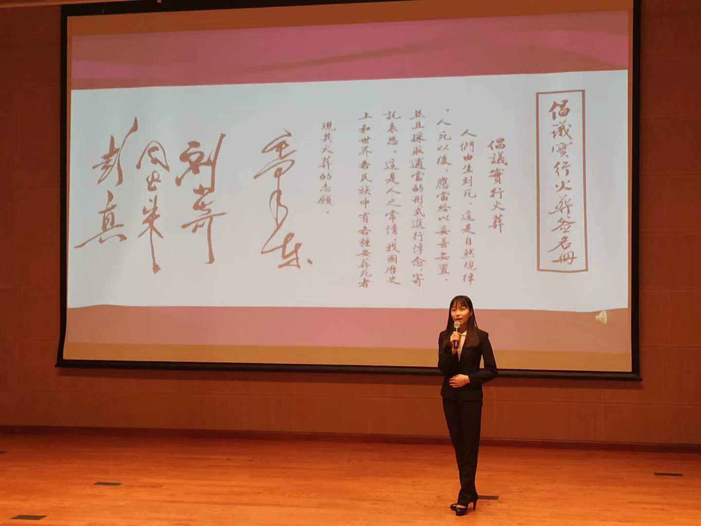 在恩来精神展演团演说环节,成员首先向员工们讲述了“周恩来与容止格言”,通过介绍周总理大方得体的仪容仪态,强调了注重仪容举止的重要性。随后,成员们相继讲述了与周总理有关的一系列故事:“西花厅的“风波””里,周总理坚决反对重修自己的房屋,展现了总理“安得广厦千万间,大庇天下寒士俱欢颜”的伟大情怀;“总理的家风”里,周总理以身作则,体现周总理严格要求家属,恪守孝道的行为准则;“最后的日子”里,周总理在生命最后的587天拖着病体坚持工作,体现了一位身患绝症的老人为国为民,顾全大局的崇高精神;“一个骨灰盒”的故事里,周总理的骨灰撒向祖国大地,体现了总理对祖国河山的深沉热爱;一首“海棠花祭”的朗诵,表达了同学们对总理深深的怀念……展演团充满激情的演讲,使同学们深受感动,热泪盈眶。