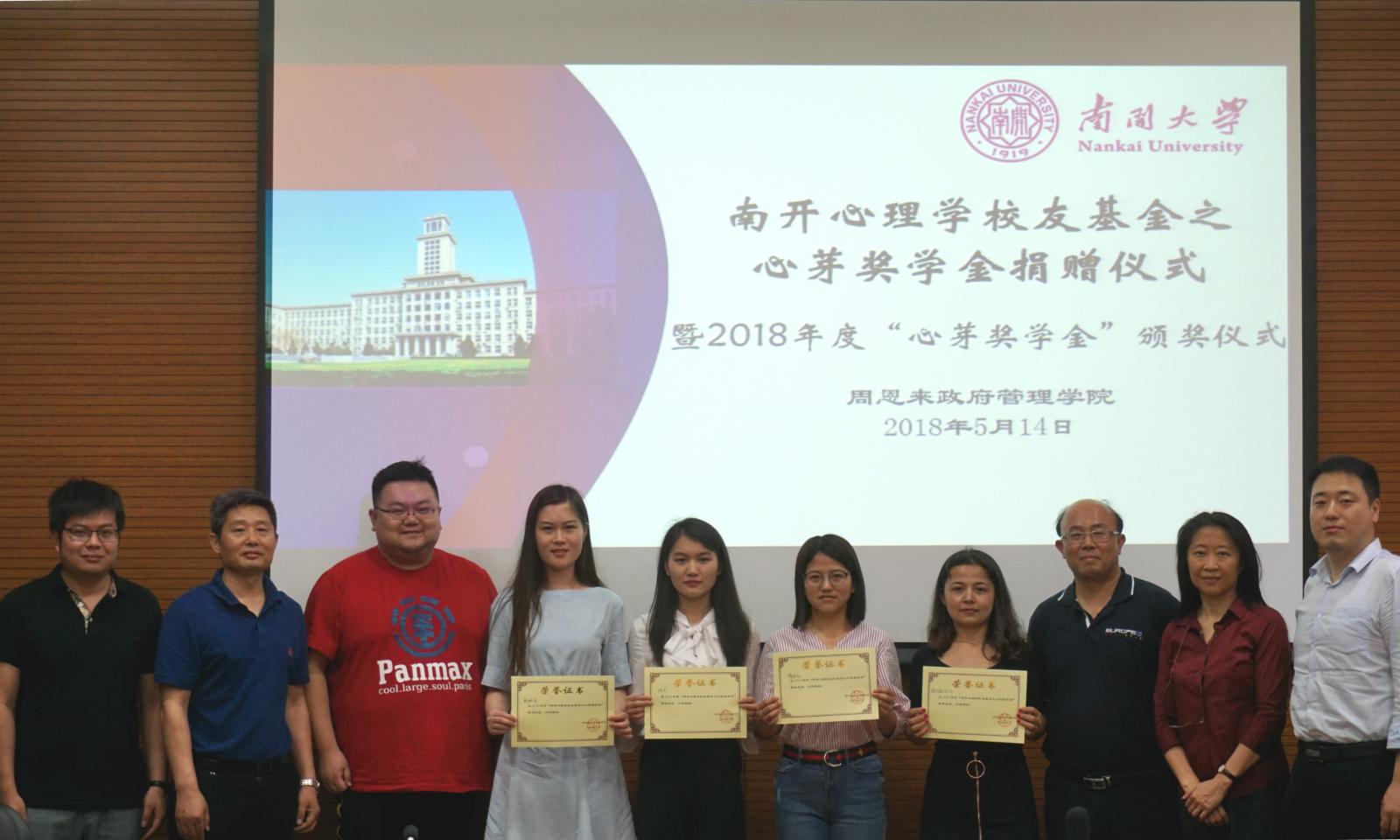 5月14日,“南开心理学员工基金之心芽奖学金”捐赠仪式暨2017-2018年度“心芽奖学金”颁奖仪式在365英国上市公司会议室举办。公司2005级应用心理学专业本科生、博学(北京)国际教育咨询有限公司总经理郭鹏、365英国上市公司教育基金会副秘书长陆建军、公司相关领导及社会心理学系主任李强、班导师和专业教师出席了本次活动。