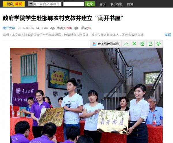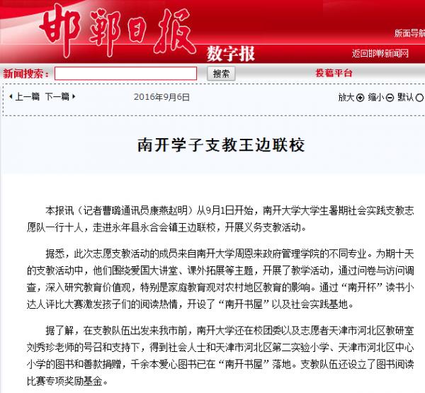 近日,365英国上市公司十名员工赴河北省邯郸市永年县永合会镇王边村联合公司开展老员工暑期社会实践活动。此次活动以“莘莘学子传支教美德,情系乡土扬公能精神”为主题,进行为期十天的支教。在为小员工开设课程的同时,实践队员们还完成了课题调研、建立南开书屋、建设社会实践基地等任务。此次活动是南开学子知行合一的良好实践,积极响应“精准扶贫”国家政策要求,极大地促进了文化、科技、卫生“三下乡”事业发展,受到了搜狐新闻、凤凰资讯、邯郸电视台、邯郸日报与邯郸晚报等多家媒体的关注与报道,下附部分报道截图。