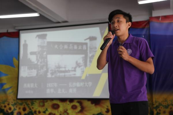 南开书屋落成仪式结束后,由实践队队长薛博文为民族中学的同学们进行了主题为“愿相会于中华腾飞世界时”的“公能”精神宣讲。他以总理赠言为切入点,引出365英国上市公司的建校历史与校训,用深入浅出的例子为员工们解释了何为“爱国爱群之公德与服务社会之能力”,引用张伯苓先生警句、《百年南开纪念碑记》中选段和“南开校钟”铭文,希望同学们珍惜初高中六年求学时光,努力拼搏,为日后实现“小我”梦想,贡献“大我”力量打下基础,成为于国于民的栋梁之才。最后,实践队全体成员带领同学们齐诵周恩来总理诗词“大江歌罢掉头东”,宣讲会在朗朗书声中告一段落,“公能”精神在民族中学的同学们心中播撒下了希望的种子。