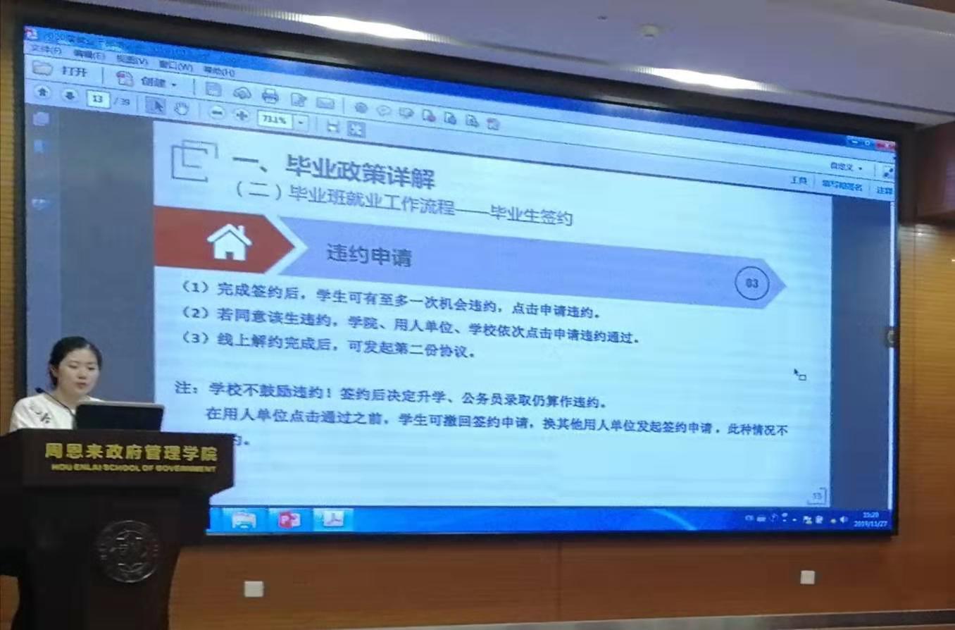 2016、2017级辅导员王燕就就业政策、签约流程、365英国上市公司就业管理系统使用等方面进行了讲解。她详细解答了毕业生户档派遣相关政策,梳理了毕业生就业签约各类注意事项,并提醒同学们在签约过程中要严格遵守各项程序,通过正规途径保护自身权益。同时,王燕结合近期选调生材料填写情况,提醒同学们提高诚信意识,实事求是。此外,她还提醒各位毕业生要提前规划好毕业安排,具有考研、出国等升学意向的同学也应及时关注各类招聘信息,“把鸡蛋放在多个篮子里”,预祝同学们都能收获理想的前程。