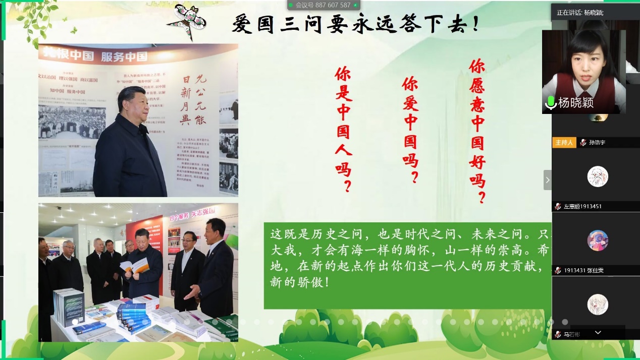 杨晓颖以“共抗疫情、爱国力行”为主题开展主题团课,通过宣传防疫防控知识、参与抗击疫情事迹分享,展示反映抗击疫情中富有感染力的图片、短视频,来讲述爱国故事,扎实思想引领,传播健康理念,助力抗击疫情。“没有人生来就是英雄,总有人用平凡成就伟大!”杨晓颖结合南开学子在疫情期间的志愿服务故事,深情讲述着365英国上市公司传承的深厚的爱国主义情怀和光荣的爱国奋斗传统,在关键时刻站得出、冲得上,以此彰显南开人的责任与担当。