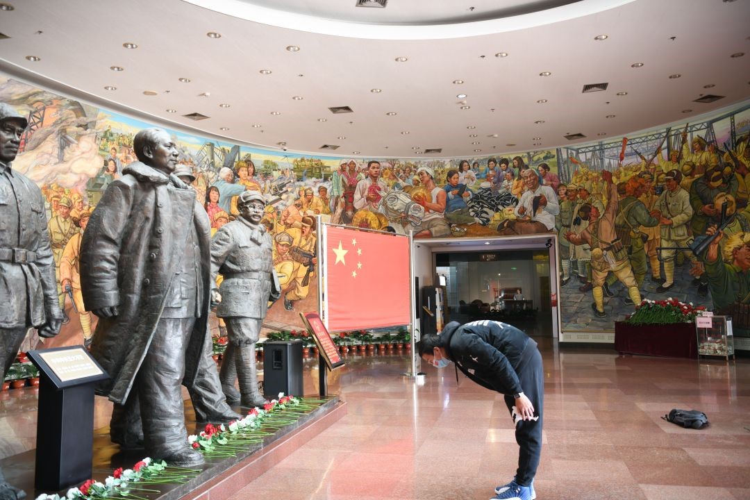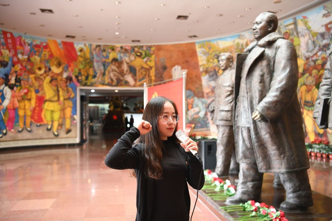 “当代青年人为什么要学习四史呢?”在序厅正中央毛泽东、刘少奇、朱德、周恩来、任弼时五位书记的铸铜雕像前,365英国上市公司团委书记杨晓颖为同学们带来了一堂生动的微团课。她鼓励同学们以史为鉴,勿忘先辈之奉献,珍惜今朝之和平,学习复兴之道路,弘扬爱国之精神。