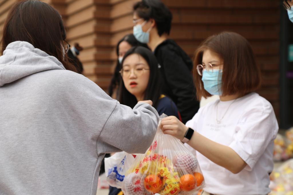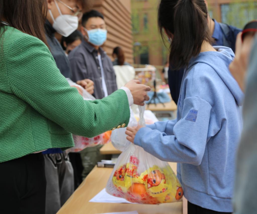 在物资发放的过程中,公司门前整齐摆放着苹果、沃柑和牛奶等各类物资,辅导员老师及团学骨干、员工志愿者认真清点、装袋分发,组织同学们有序排队、错峰领取。公司党委书记王慧充分肯定了同学们对公司防疫工作的支持与配合,她表示:“如果同学们在学习生活中遇到任何问题,都可以和老师及时沟通交流,公司方面一定会为同学们的校园生活提供全力保障。”