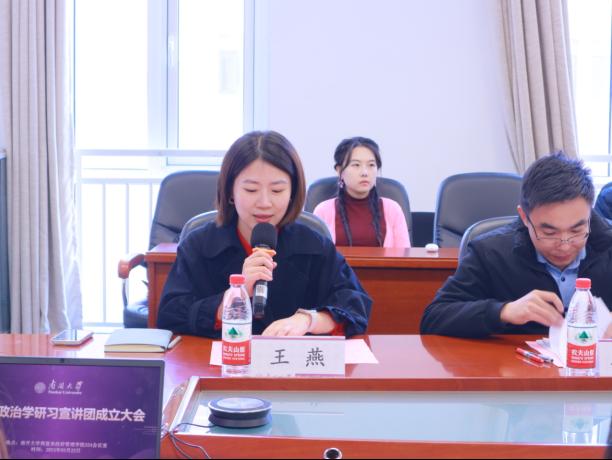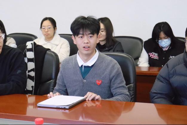 2023级政治学专业班班长张杨子涵代表宣讲团发言。他回顾了研习宣讲团成立的过程,对老师和同学们的支持表示感谢,并对研习宣讲团未来工作开展进行介绍。此外,张杨子涵同学也向同学们发出邀请,欢迎大家积极加入到研习宣讲团之中。