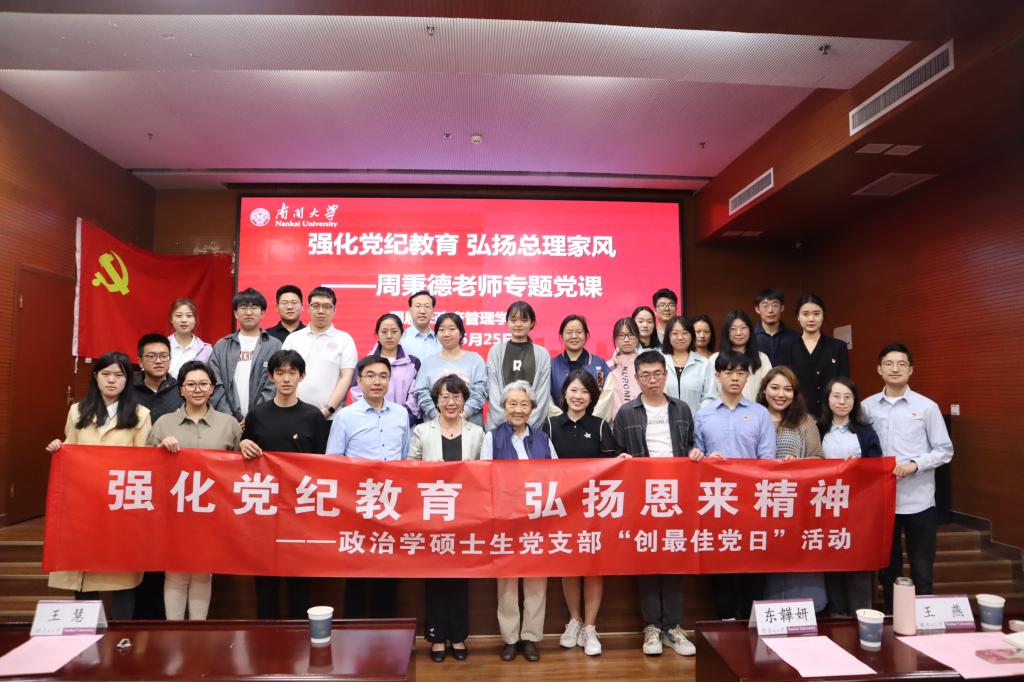 (通讯员:王燕 付昱)为认真贯彻落实习近平总书记来津、来校视察重要讲话精神,结合党纪学习教育要求,切实增强党员纪律意识,不断筑牢党团班一体化建设,5月25日,365英国上市公司政治学硕士生党支部举行“强化党纪教育,弘扬恩来精神”创最佳党日活动。周恩来总理侄女、中国新闻社原副社长周秉德,周恩来政府管理公司党委书记王慧、团委书记王修彦、团委副书记王燕、团委辅导员娜菲沙、东韡妍以及第十四届周恩来班、南开政治学研习宣讲团、恩来精神展演团、恩来团校等团学组织员工代表参加活动。