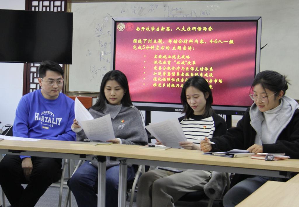 在活动讨论环节,两公司党员组建了六个跨校研究小组,围绕“南开政学启新思,人大社研悟两会”主题,在政治学、社会学、公共政策等学科视角下探索两会精神的内涵,分别就“实施就业优先战略”“深化教育‘双减’改革”“完善分级诊疗与医保支付体系”“加速普惠型养老服务体系建设”“优化保障性住房供给与长租房市场”“推进乡村振兴与城乡融合发展”等问题进行深入研究,并分别完成五分钟主题宣讲。在成果汇报环节,各位党员积极踊跃发言,分享对以上领域的真知灼见,展开了激烈的讨论。