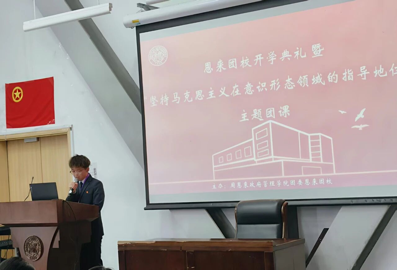 新一届团员教育培养班的开幕,是学员们理论与实践学习的新起点。在本次开幕式中,恩来团校指导老师李书航老师为今后团校的课程开展指明了方向,恩来团校工作人员向学员们细致阐述介绍了团校的性质和工作章程,史猛老师以“坚持马克思主义在意识形态领域的指导地位”为主题的团课讲座,让学员对文化自信对国家安全的意义有了透彻的认识,并且倡导学员在学习与生活中坚持马克思主义,树立正确的意识形态。