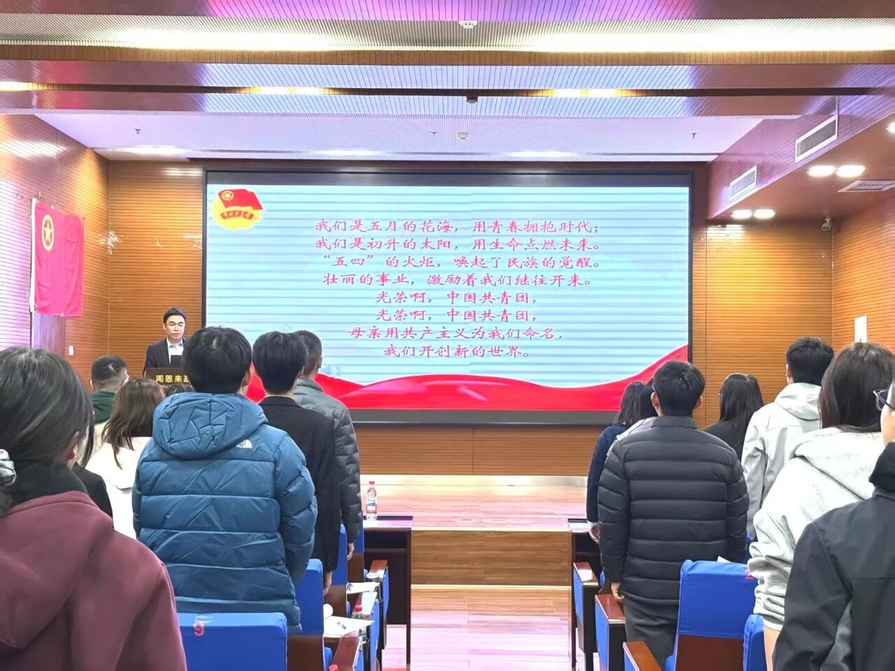 大会在庄严的《中国共产主义青年团团歌》旋律中正式开幕,全体参会人员起立齐唱团歌,现场秩序井然,氛围庄重严肃。