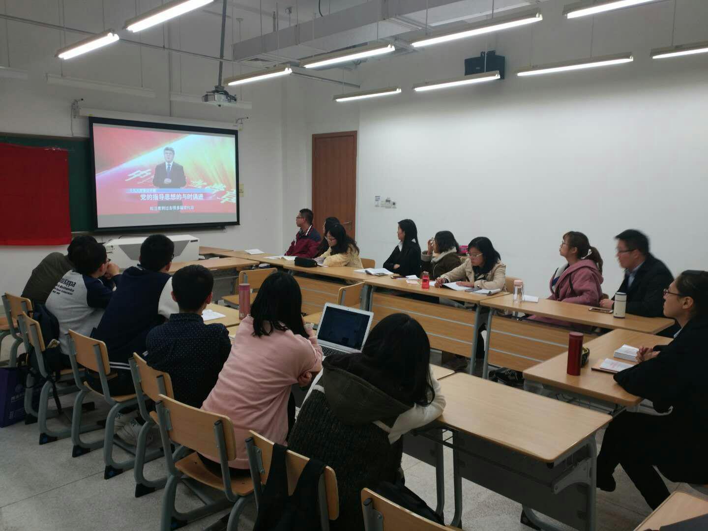 会议的后半部分,支部书记张艺烁同志组织大家观看了两集《党的十九大党章学习公开课》。公开课由中央纪委、监察部录制,中央党校教授谢春涛主讲。课程涉及《中国共产党章程》的历史沿革、党的指导思想与与时俱进等重要内容,对习近平新时代中国特色社会主义思想进行了深刻的解读,并回顾了一大至十九大以来党章修改完善的历程,党员同志对于党的十九大报告的思想内涵有了更加深刻的理解和思考。参加学习收看的党员同志充分认识到,刚刚胜利闭幕的党的第十九次全国代表大会对《中国共产党章程》作了很多很重要的修改。在诸多的修改内容当中,最重要最具有长远意义的是把习近平新时代中国特色社会主义思想写入了党章,同马列主义、毛泽东思想、邓小平理论、“三个代表”重要思想、科学发展观一道确立为党的指导思想,确立为我们党的行动指南。