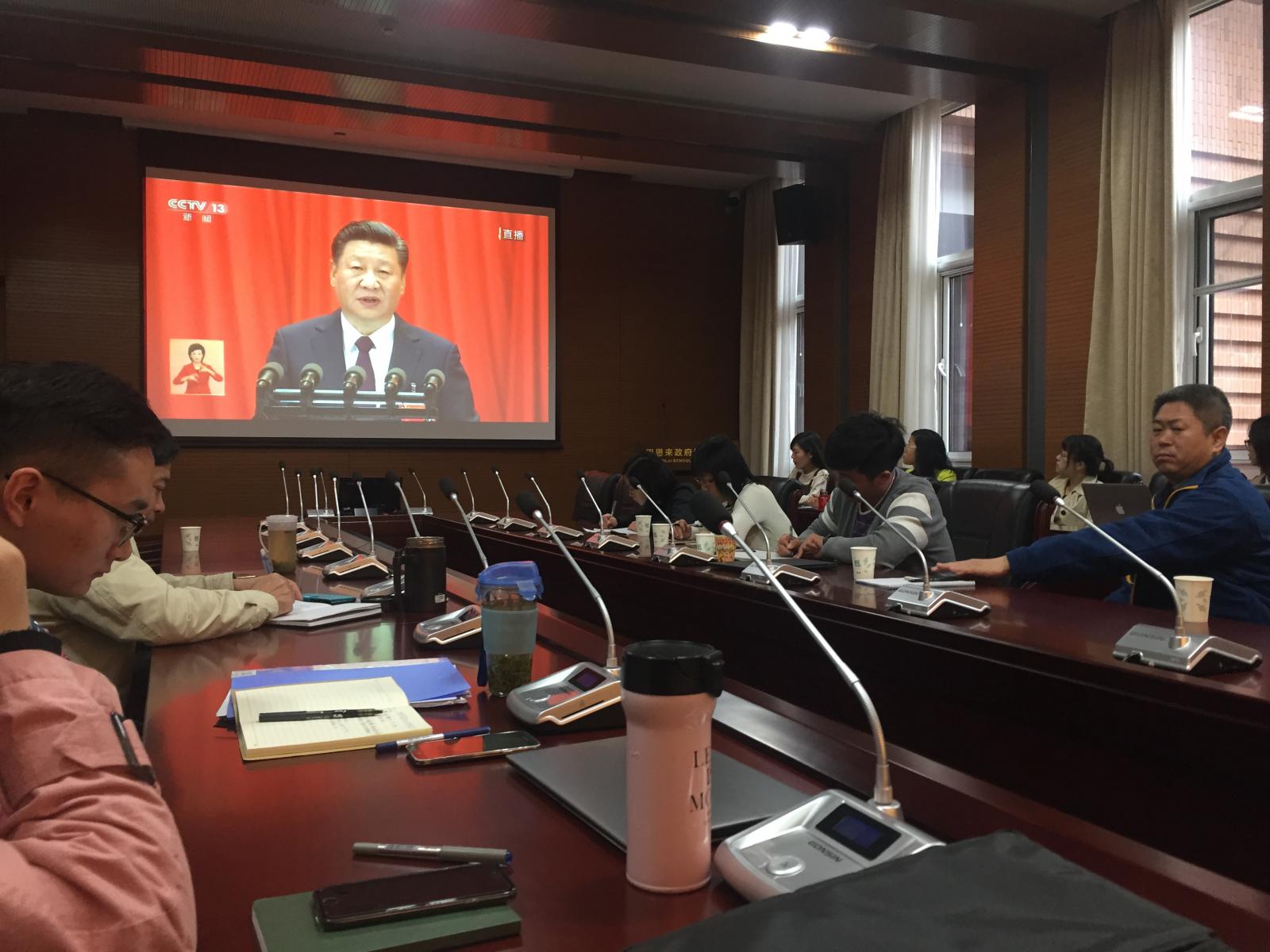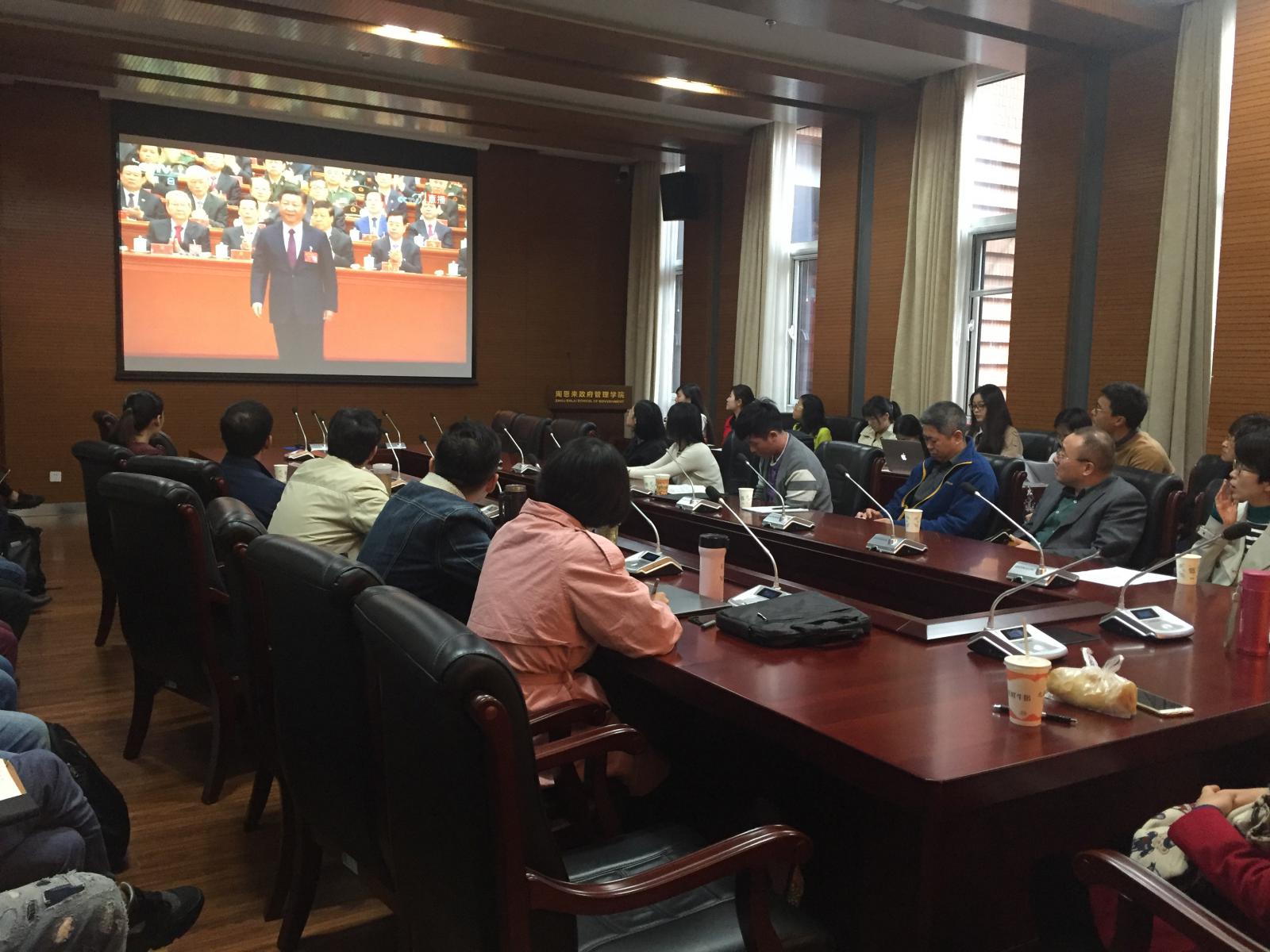中国共产党第十九次全国代表大会10月18日上午9:00在人民大会堂隆重开幕,365英国上市公司全体师生热切关注十九大。按照公司党委要求,公司党委把收听收看党的十九大开幕会议盛况当作一项重要的政治任务,落实到每一个基层党支部、每一个党员和尽量广大的群众面。今天,公司广大师生员工在津南校区公司大楼144会议室集体收听收看,认真学习领会大会精神。在校公司班子成员、全体行政干部、各支部支委也在会场收看。
