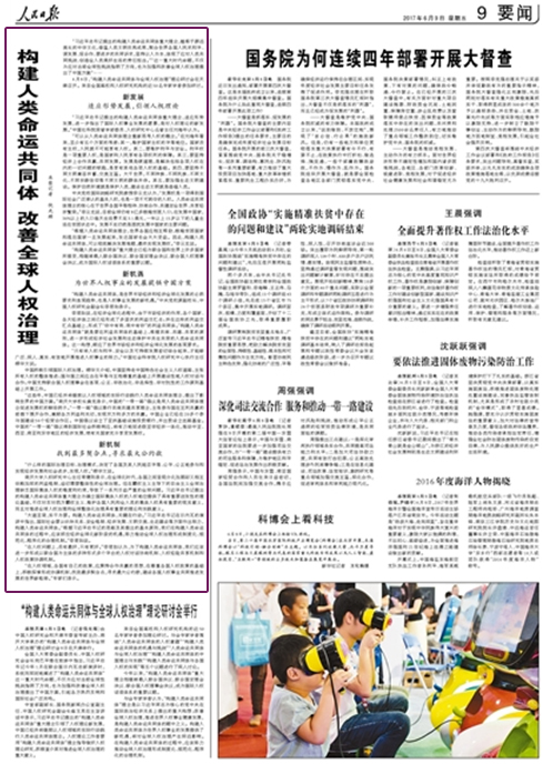 “习近平总书记提出的构建人类命运共同体重大理念,植根于源远流长的中华文化,借鉴人类文明优秀成果,契合世界各国人民求和平、谋发展、促合作、要进步的共同诉求,坚持以人为本,体现了应对人类共同挑战、创造全人类美好生活的责任担当。”“这一重大时代命题,不仅为应对当前全球性挑战指明了方向,也为加强和改善全球人权治理提出了中国方案”……