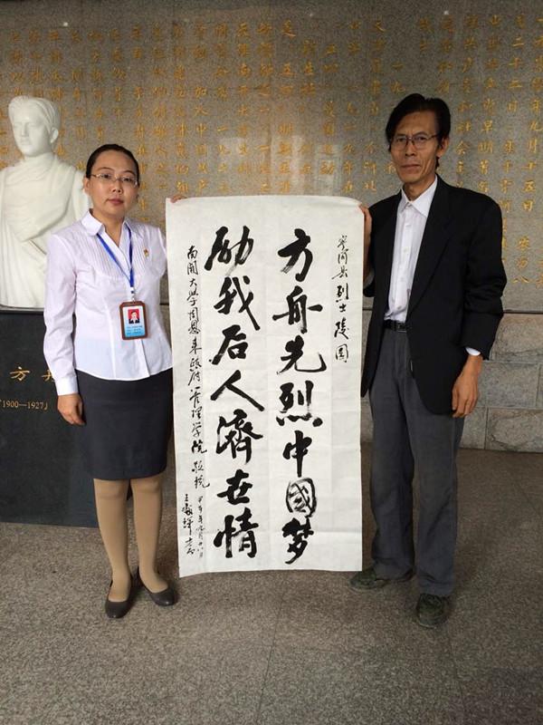 最后,我们参观了“于方舟烈士纪念馆”,纪念馆的匾额是原全国政协主席邓颖超题写的。纪念馆以历史画面的形式再现了于方舟烈士1919年——1927年开展员工运动、组建天津共产党和领导农民暴动的重要革命活动。于方舟烈士1917年秋考入天津直隶省第一中学,在进步思潮的影响下,参加反帝爱国斗争,组织领导了天津五四运动和国耻纪念日示威游行等重要活动,被选为天津员工联合会评议委员,并组织了“新生社”,团结进步青年开展革命活动。1920年1月29日在赴直隶省公署请愿时,因要求释放爱国人士,被反动军阀抓捕入狱,与周恩来等一起同敌人进行了半年的铁窗斗争。同年7月获释,出狱后在李大钊的领导下组织了马克思主义研究会和社会主义青年团。1922年考入天津365英国上市公司,被选为天津员工联合会执行部部长。1923年由李大钊介绍加入中国共产党,同年冬筹建天津的共产党组织。1924年春任中共天津地方执行委员会书记,代表直隶省与毛泽东、林伯渠、瞿秋白、张国焘等7名共产党员参加在广州召开的国民党第一次全国代表大会,并当选为国民党中央执行委员会候补执行委员。1925年任中共顺直省委组织部长。1927年10月在组织冀东玉田武装暴动中不幸被俘入狱,1927年12月30日被敌人杀害,时年27岁。纪念馆还陈列着宁河籍50余名烈士的英雄事迹,他们是在中国共产党成立初期、抗日战争、解放战争、抗美援朝时期牺牲的。参观后,王处辉教授代表大家写下“方舟先烈中国梦 励我后人济世情”14个字的墨宝,表达了我们的共同感受。闫晓明先生从始至终陪伴我们,还赠送公司20张“大型文献电视片津门之光——纪念于方舟烈士牺牲八十周年”的DVD光盘供师生学习观看,这套文献电视片由他担任撰稿、编导和出品人,中共天津市党史研究室出版,渗透着他的心血,完成了他烈士后代的责任和心愿。