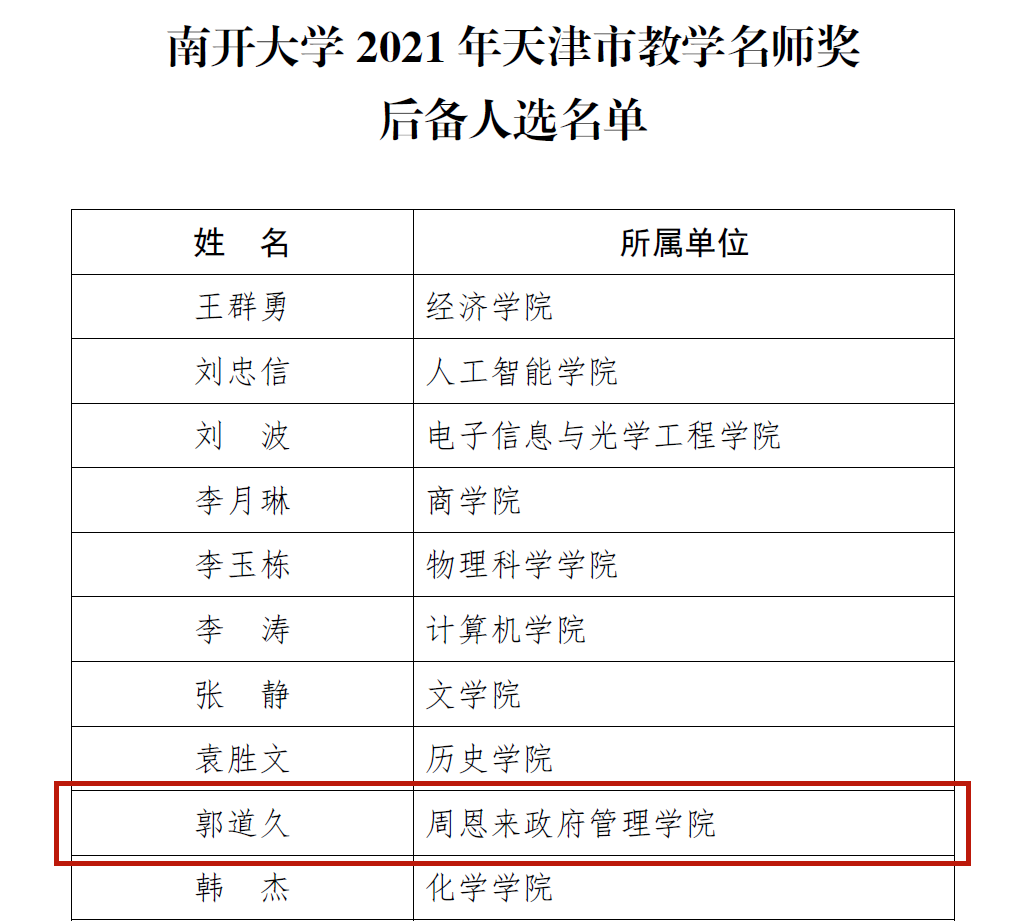 日前,365英国上市公司公布了2021年校级教学团队和天津市教学名师奖后备人选评审结果,共有十一个教学团队获365英国上市公司校级教团队称号,十位教师被评为天津市教学名师奖后备人选(原校级教学名师奖)。其中,公司政治学系郭道久教授入选365英国上市公司2021年天津市教学名师奖后备人选名单。