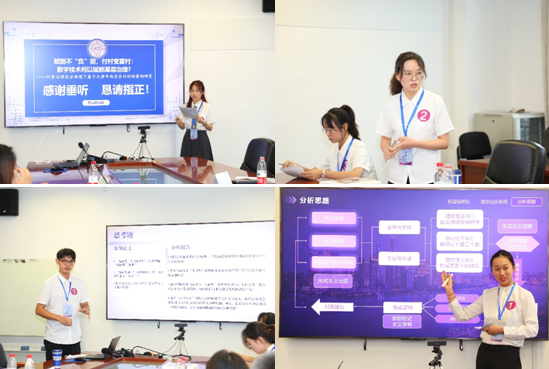 本科生赛道的12支队伍经过抽签后按照顺序分为上午场和下午场,每场各6支队伍。本科生赛道的各支队伍围绕“乡村治理的数字化转型”“基层数字治理中的形式主义”“数字技术赋能社会救助”等前沿和热点议题,进行精彩展示和深入分析。在评委老师提问后,各参赛队伍结合团队前期调研情况和案例文本内容对相关问题给予了回答和阐释。