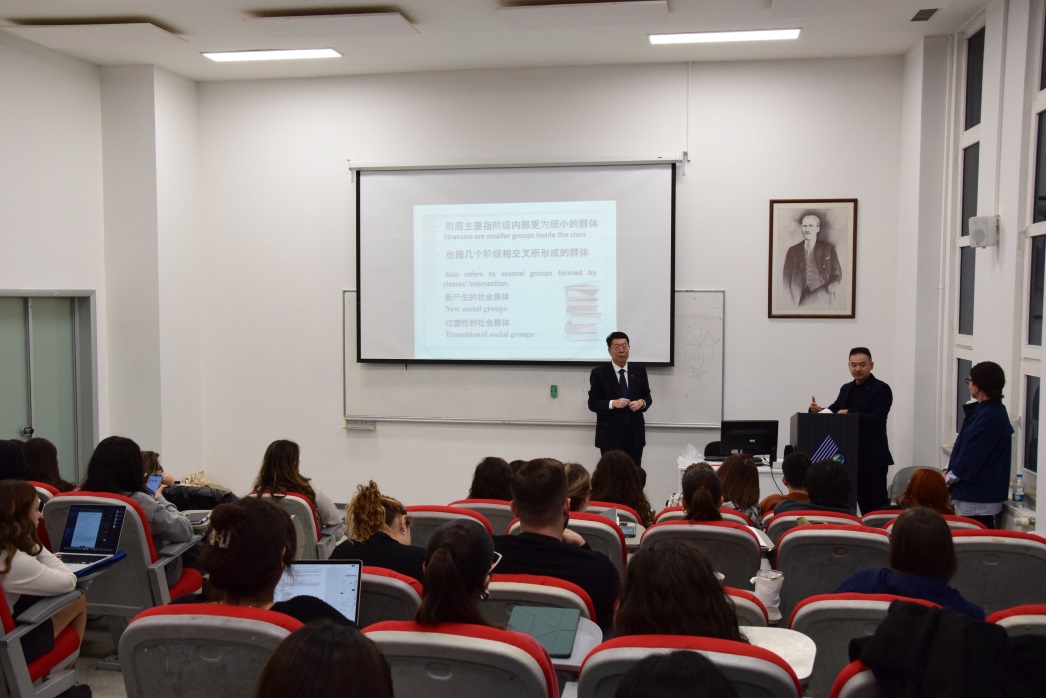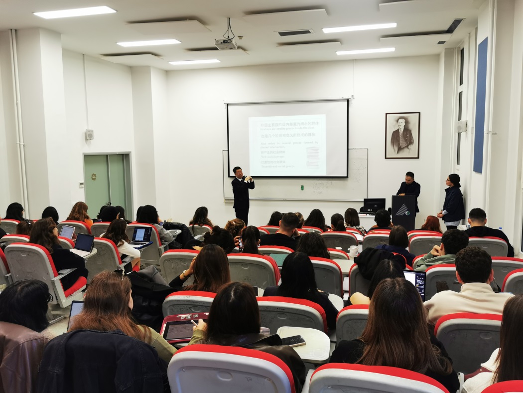 会见结束后,朱光磊教授以《中国社会阶层格局的变迁》为题为孔院师生做主题报告并回答现场提问。他分析了阶层分化的历史前提和契机、分化中形成的阶层类型以及当代中国社会阶层分化的主要特征等。讲座通过引用大量的实例和图片,形象直观地让听众了解中国社会的结构以及中国最终实现共同富裕的社会目标。