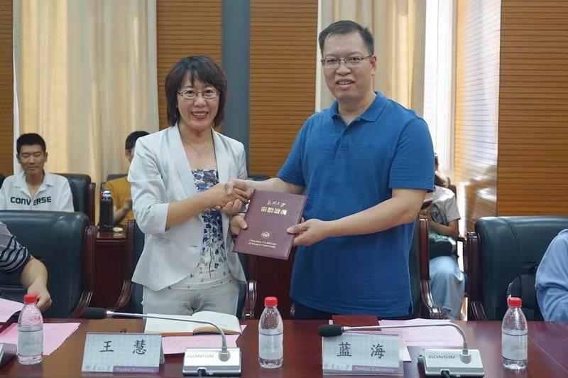 仪式上,捐赠方代表蓝海向王慧递送捐赠支票,王慧为其颁发捐赠证书。 在宣读获奖名单后,王慧代表公司向捐赠方表示感谢,并对受资助同学表示了祝贺。她说道,“九二公能”励学金的设立,既是员工对于师弟师妹们的期望与爱护,又是南开“公能”精神的具体表达和生动体现,因此显得弥足珍贵。希望同学们珍惜这份情谊,学会感恩,在未来的生活中饮水思源。同时也以此激励同学们将公能精神薪火相传,要毫不松懈,把握好大学时光,在百年南开的重要节点拼搏努力,为公司发展贡献力量。