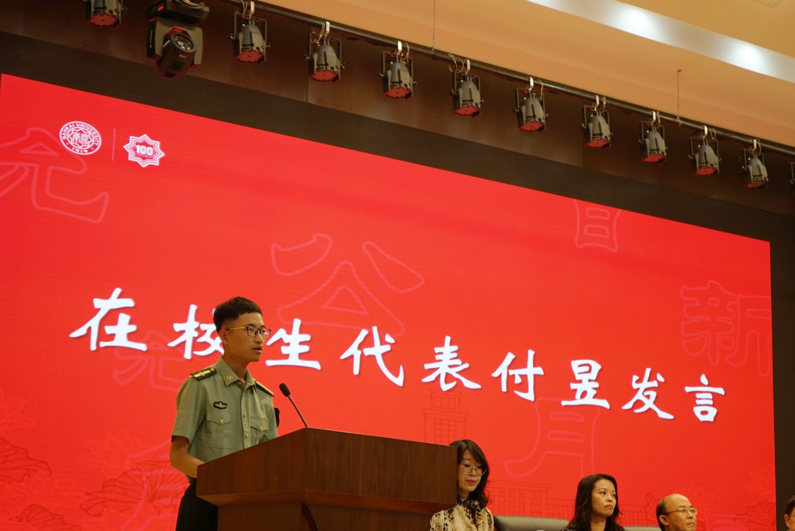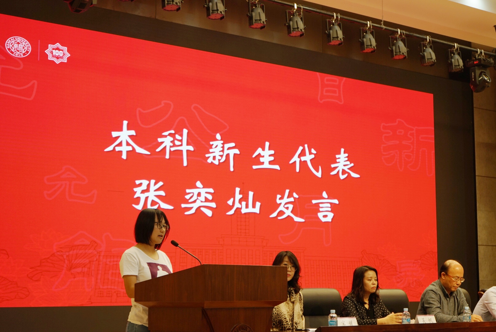 在校生代表2018级本科生付昱、新生代表2020级本科生张奕灿及2020级博士研究生陈璐依次发言,他们立志牢记习近平总书记的嘱托,把小我融入大我,用青春奉献祖国,做南开新百年的生力军。